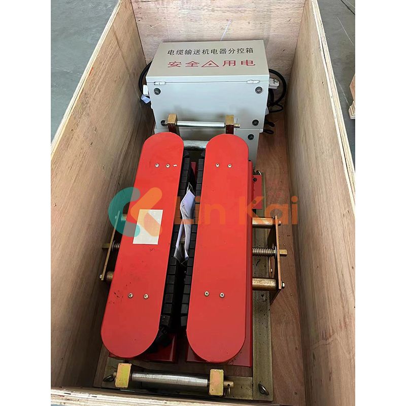 Машината за издърпване на конвейерни кабели на едро приложеното напрежение е 380 V AC, електрическото задвижване от две оси, задвижването е равномерно и с нисък шум. Гъсеницата е изработена от неопрен с висока якост, капачката защитава добре изолационния кабел и може да се използва дълго време.